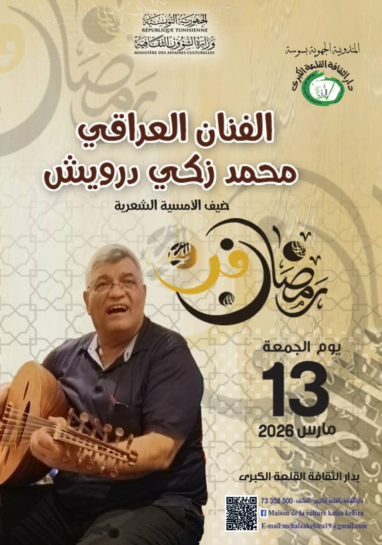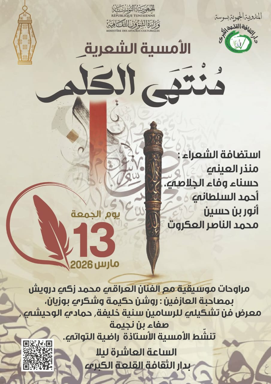 الشعب نيوز / المنذر العيني – أنارت دار الثّقافة القلعة الكبرى ليالي رمضان بأمسية ثقافية متنوّعة ” منتهى الكلِم” جمعت بين الموسيقى والفنون التّشكيلية والشّعر في فضاء قاعة العرض الكبرى .