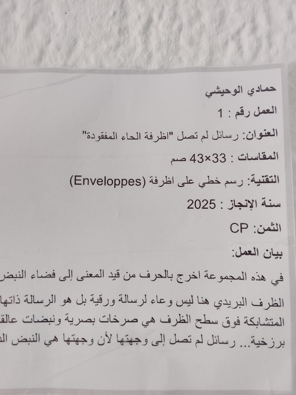 لقاء ثريّ تمايزت فيه التدخلات حيث انطلق بعدها التشكيل في توليفاتها في دارته الفنيّة التركيبية التي هيّأها الفنان التشكيلي حمادي الوحيشي في إعلاء مغاير للمادة لها ما لها من مطارحات تأويلية ثمّ اعتنى برصد لوحاته ” أظرفة الحاء المفقودة” تحت عنوان جامع ” رسائل لم تصل” من خلالها أبان عن إمضاءات خطيّة تنزاح فيها الخطوط عن تواصلها الأوّلي لتبني حيّزا حيّا في المجادلة مع ما يترسّم من جسد ينطبع في كلّ مرّة على المحمل.