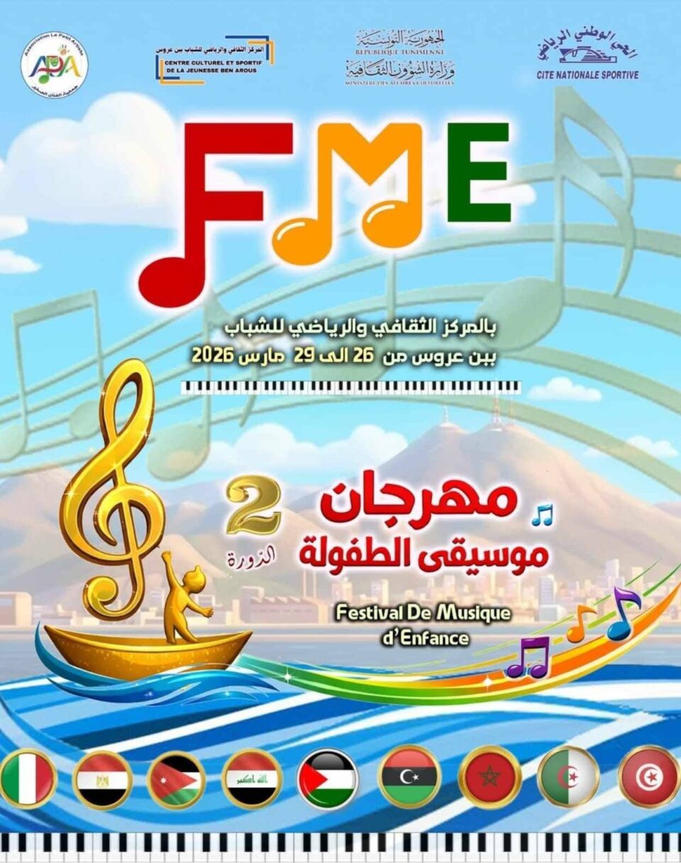 الشعب نيوز / ناجح مبارك – تنطلق يوم غد الخميس 26 مارس 2026 فعاليات الدورة الثانية لمهرجان موسيقى الطفولة الذي ينظمه المركز الثقافي والرياضي للشباب ببن عروس بالشراكة مع جمعية الفنان الصغير وبدعم من وزارة الشؤون الثقافية و الحي الوطني الرياضي على أن تختتم فعاليات المهرجان يوم الأحد 29 مارس 2026 .