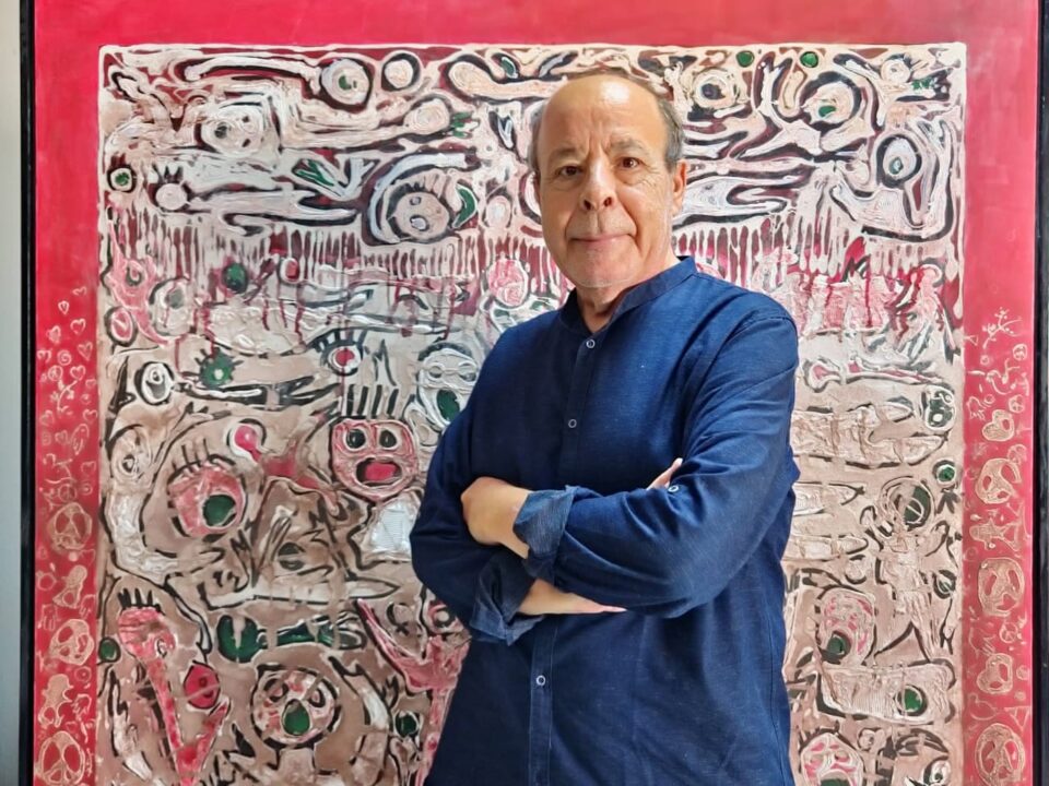 يواصل في انسجامه مع الفكرة عبر معارضه وورشاته حتّى غدا للمسيرة عنوان عالميّ ينطلق ممّا أملته المفاهيم المتعاقبة الخالقة لفعله التّحرّري يستنطق من أرصدة غائرة عاملة هي من ألق التّسمية أو من صميم أفكاره عبر متناولات من القراءات والمسارات والتراتيب الهيكليّة في نشأةٍ ونشوءٍ :” الأرض” بكارتها، أوجلالها، أو روحانيّاتيها، في إرسالات بيانيّة تنفتح وتنغلق مع طاقات التّأويل في الوصل بين ما تبنيه التّقنيات شغفا متواترا محكما منضبطا وبين ما تُنبّه إليه من انجرافات رائيّة تتلوها أخرى، ماضية في خلق حساسيّاتٍ لا تصل أبدا، من مخبر إلى ٱخر أو من مشغل إلى ٱخر في حوّافها المطلّة على الواقع أو على ما يفوقه في عطورها وتقاسيمها وشجونها وإنباءاتها وما تفرضه من ٱذانٍ ومن طقوس منذورة ومن خشوع وخشية لافتة عبر ما تتوسّمه من حياةٍ ذات قداسة ضمن أروقة تأمّليّة وقراءات.
