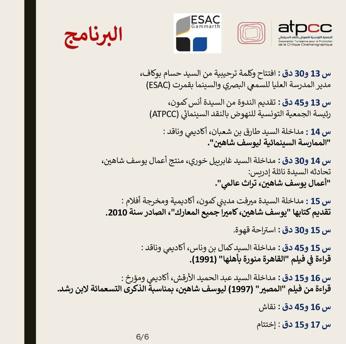 الشعب نيوز / ناجح مبارك –  تحتفي ادارة المدرسة العليا للسمعي البصري بقمرت مساء اليوم الأربعاء 15 افريل 2026 وبالتعاون مع الجمعية التونسية للنهوض بالنقد السينمائي بفضاء المؤسسة الجامعية وبين طلبتها بمائوية الفنان السينمائي يوسف شاهين .