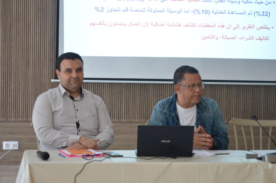 الشعب نيوز / أبو خليل – نظم قسم الدراسات والتوثيق اليوم الجمعة 17 أفريل 2026 بمقر الاتحاد ورشة عمل تم خلالها تقديم نتائج البحث الميداني ودراسة حول عمال المنصات تحت إشراف الأخ أحمد الجزيري الأمين العام المساعد المسؤول عن قسم الدراسات والتوثيق ، بحضور الإخوة فخري الدين العويتي و بولبابة السالمي و الطيب البحري و الاخت نهلة الصيادي اعضاء المكتب التنفيذي الوطني وبحضور ممثلي منظمة العمل الدولية .