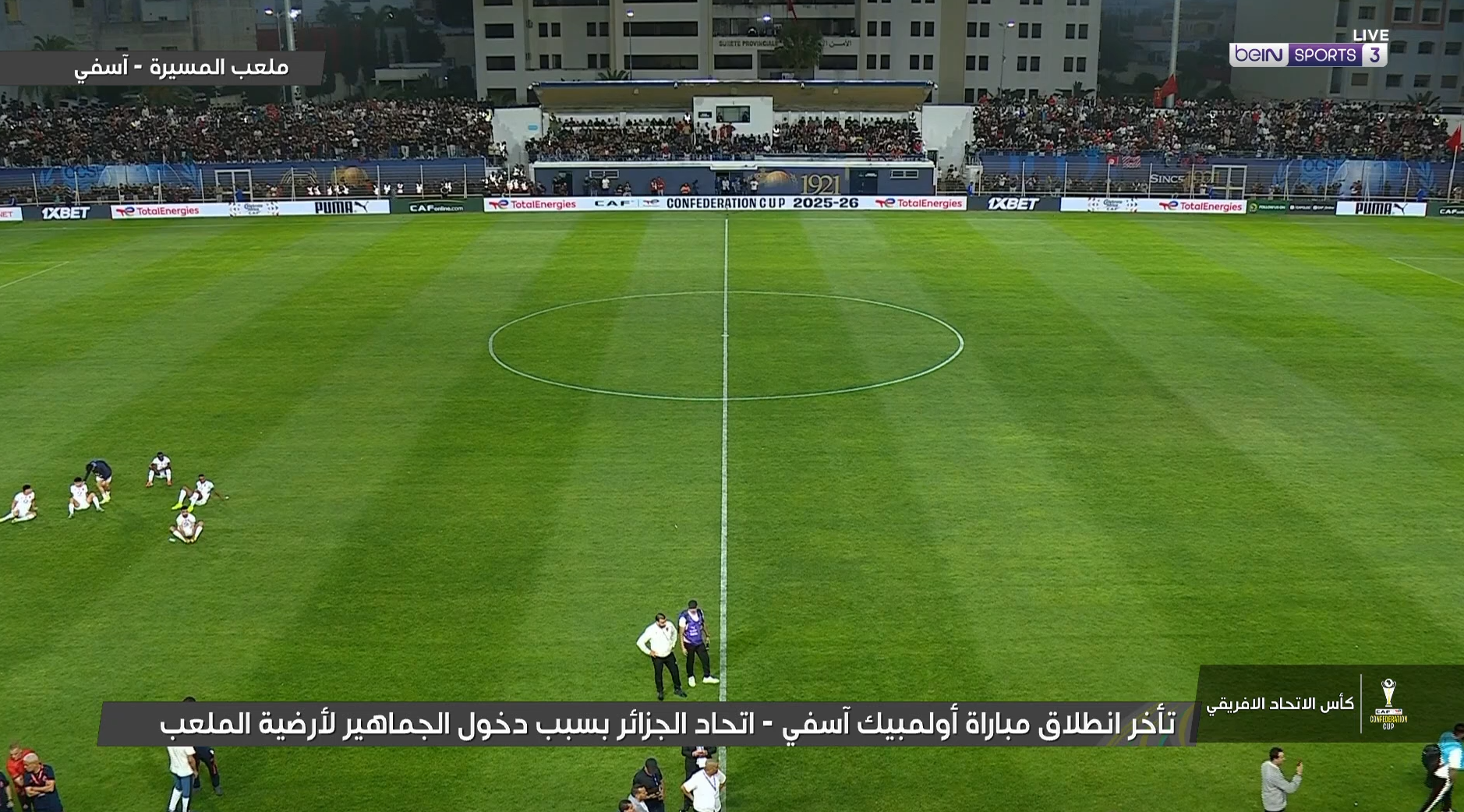 * تأخر انطلاق لقاء أولمبيك آسفي واتحاد الجزائر بسبب نزول الجماهير إلى أرضية الميدان