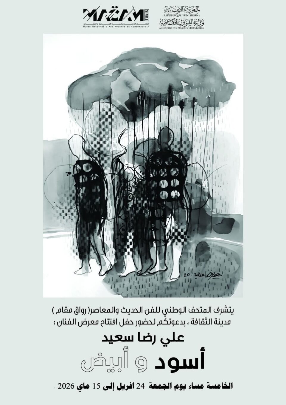 الشعب نيوز / ناجح مبارك – ينتظم حفل افتتاح المعرض الشخصي “أسود وأبيض” للفنان علي رضا سعيد الذي يستضيفه – رواق المتحف الوطني للفن الحديث والمعاصر(مقام) بمدينة الثقافية الشاذلي القليبي – تونس ، اليوم الجمعة 24 أفريل 2026 على الساعة الخامسة مساءً، ليتواصل إلى غاية 15 ماي 2026.