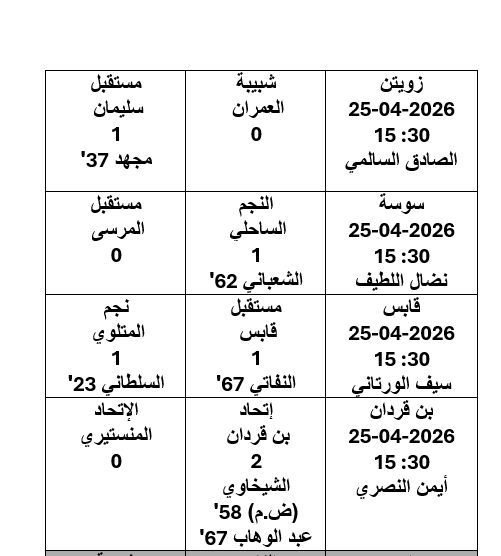 جرت اليوم السبت 25 أفريل 2026 مباريات الدفعة الأولى من مقابلات الجولة 11 إياب لبطولة الرابطة المحترفة الأولى لكرة القدم موسم 2025-2026 وأسفرت عن النتائج التالية :