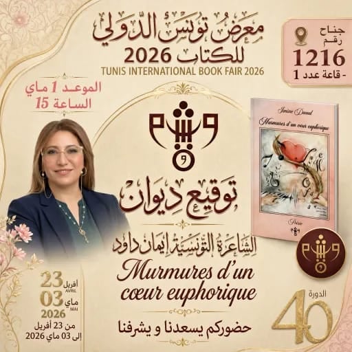 الشعب نيوز / ناجح مبارك – ضمن نشاطها الأدبي و الشعري و الثقافي توقع الشاعرة ايمان داود ديوانها الشعري باللغة الفرنسية بعنوان “همسات قلب مبتهج”  و ذلك بمعرض تونس الدولي للكتاب بجناح دار وشمة للنشر و التوزيع يوم الجمعة 01 ماي 2026  و يكون ذلك ضمن عدد من الفعاليات التي شاركت فيها الشاعرة حيث تم تكريمها  و تقول عن هذا اللقاء لتوقيع ديوانها الصادر عن دار وشمة للنشر و التوزيع “…يسعدني ويشرفني أن أدعوكم لمشاركتي لحظة أدبية مميزة،حيث سأوقع باكورة أعمالي، ديوان شعر باللغة الفرنسية, صادر عن دار وشمة للنشر والتوزيع وذلك ضمن فعاليات معرض تونس الدولي للكتاب 2026…