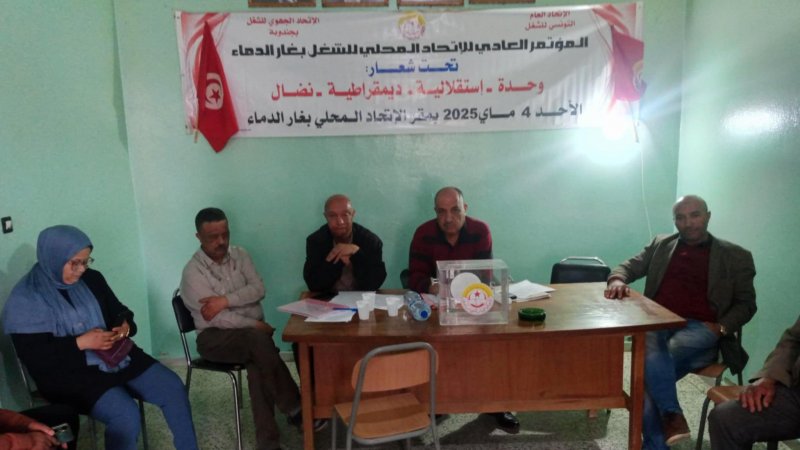 الشعب نيوز / جندوبة - أسفر المؤتمر العادي للإتحاد المحلي للشغل بغار الدماء - وادي مليز المنعقد يوم الأحد 4 ماي 2025 بإشراف الإتحاد الجهوي للشغل بجندوبة عن إنتخاب المكتب النقابي الجديد التالي :