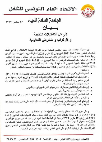 وفي هذا السياق، عبّرت الجامعة عن استنكارها لإحداث لجنة بموجب مقرر الإدارة العامة عدد 1313 المؤرخ في 24 جويلية 2025، للنظر في منع التكفل ببعض أعباء التعاونية استنادًا إلى المنشور عدد 5، معتبرة ذلك تهديدًا للسلم الاجتماعي داخل المؤسسة.