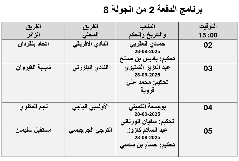 وتلعب يوم الاحد 26 سبتمبر 2025، وحسب البرنامج المرافق، الدفعة الثانية من مقابلات الجولة الثامنة و هي تهم الأربع مقابلات التالية :