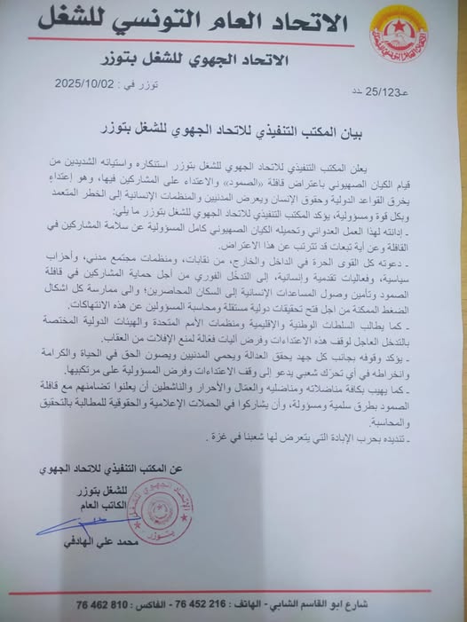 في ما يلي صورة لنص بيان الإتحاد الجهوي للشغل بتوزر الصادر اليوم الخميس 2 أكتوبر 2025 :