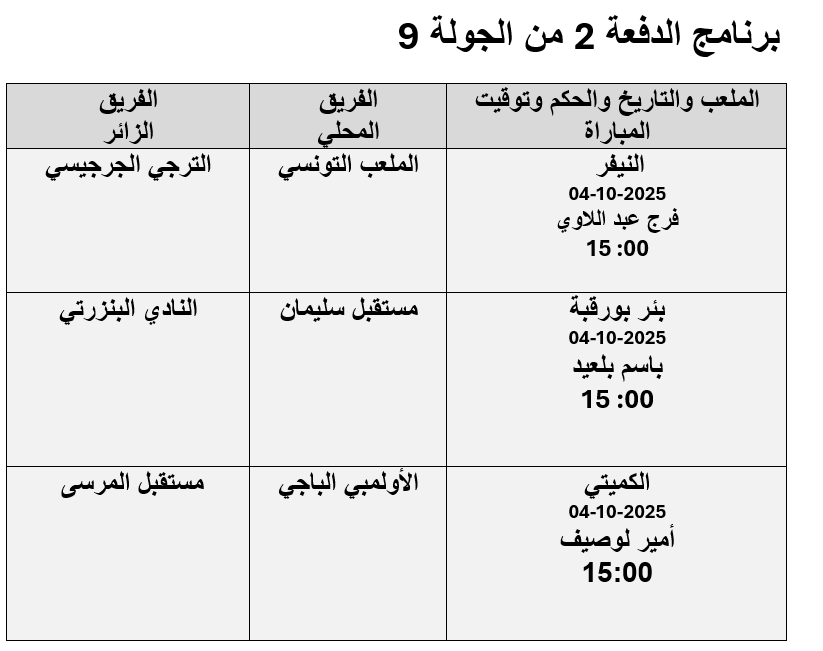 و تلعب يوم غد السبت 4 أكتوبر 2025 ، حسب البرنامج المرافق ، مباريات الدفعة الثانية من الجولة التاسعة وهي الأخرى تهم المقابلات الثلاث التالية :