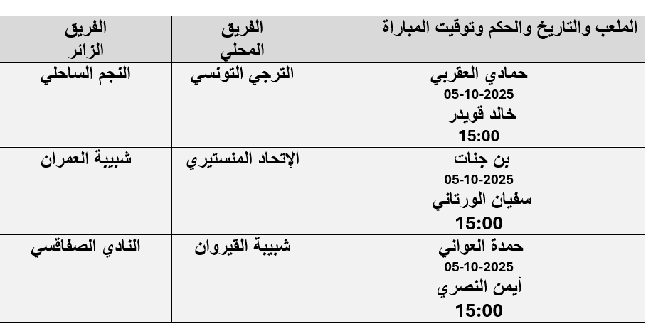 تُستكمل اليوم الأحد 5 أكتوبر 2025 منافسات الجولة التاسعة من بطولة الرابطة المحترفة الأولى، حيث تتجه الأنظار إلى ملعب حمادي العقربي برادس الذي يحتضن قمة الجولة بين الترجي التونسي والنجم الساحلي، وسط أجواء مشحونة بعد جدل التحكيم والتصريحات المتبادلة بين الناديين.