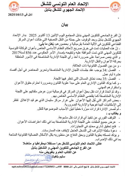 في ما يلي صورة لنص بيان الفرع الجامعي للتكوين المهني بنابل الصادر اليوم الإثنين 13 أكتوبر 2025: