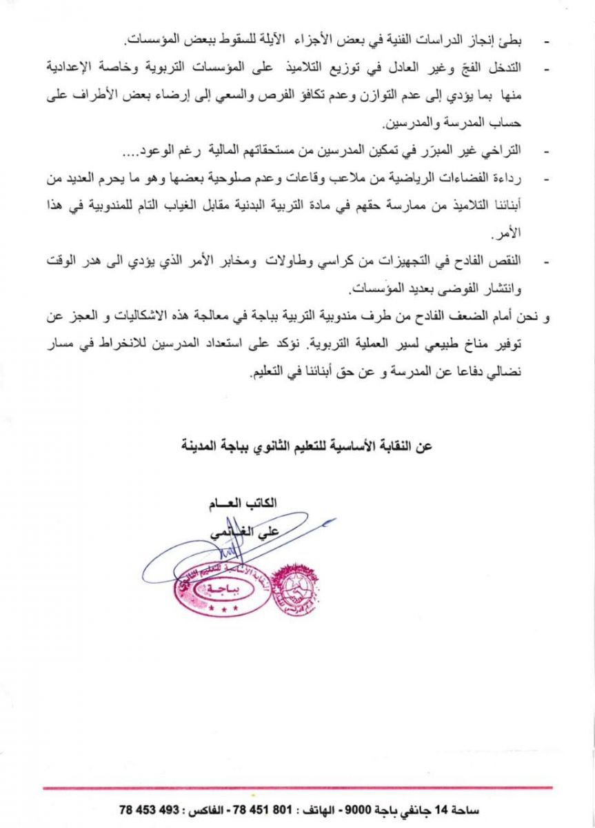 في ما يلي صورة لنص بيان النقابة الأساسية للتعليم الثانوي بباجة المدينة :