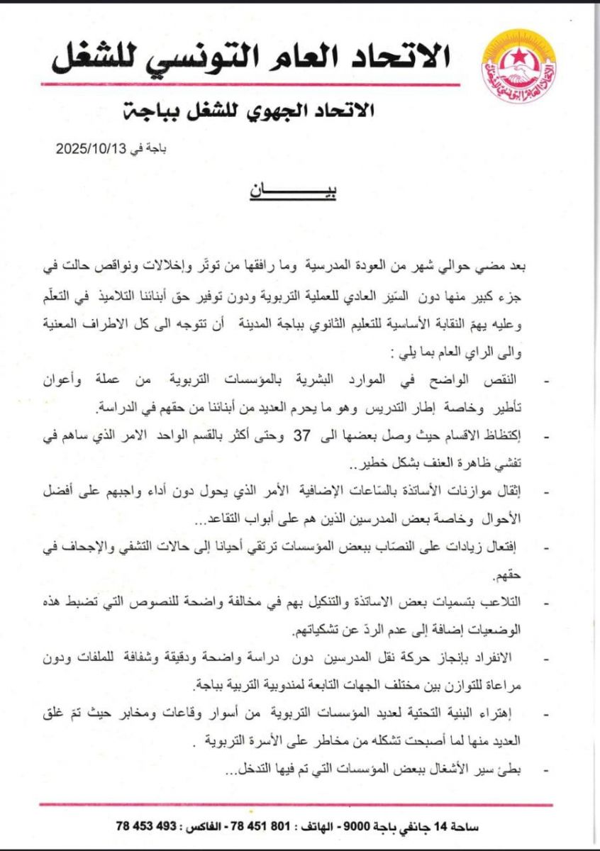 الشعب نيوز / باجة - عبّرت النقابة الأساسية للتعليم الثانوي بباجة المدينة عن قلقها العميق إزاء ما وصفته بالتدهور الخطير في ظروف العودة المدرسية، بعد مرور قرابة شهر على انطلاق السنة الدراسية، مشيرة إلى أن جملة من الإخلالات والنواقص حالت دون السير العادي للعملية التربوية وحرمت العديد من التلاميذ من حقهم في التعلم .