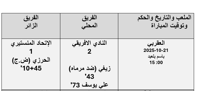 الشعب نيوز / كاظم بن عمار -  جرت اليوم الثلاثاء 21  أكتوبر 2025 مباراة  النادي الإفريقي و الإتحاد المنستيري  ضمن الدفعة الثالثة من مقابلات الجولة العاشرة  لبطولة الرابطة المحترفة الأولى لكرة القدم   وأسفرت عن النتيجة التالية :