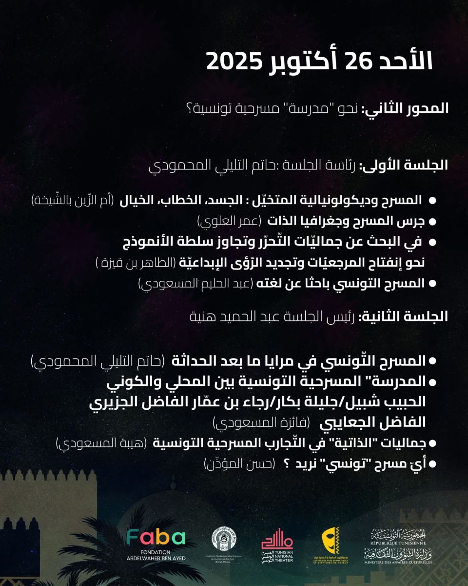 الشعب نيوز / ناجح مبارك - في إطار فعاليات الدورة الثالثة من المهرجان الوطني للمسرح – مواسم الإبداع، تنظَّم ندوة علمية كبرى بتوزر يومي السبت و الأحد 25 و26 أكتوبر 2025، بالشراكة بين المسرح الوطني التونسي والمجمع التونسي للعلوم والآداب والفنون "بيت الحكمة"، تحت عنوان: "المسرح التونسي: أسئلة "الهوية" و " الغيرية" وتمثّلات "الذاتية"– نحو "مدرسة تونسية" في المسرح ؟".