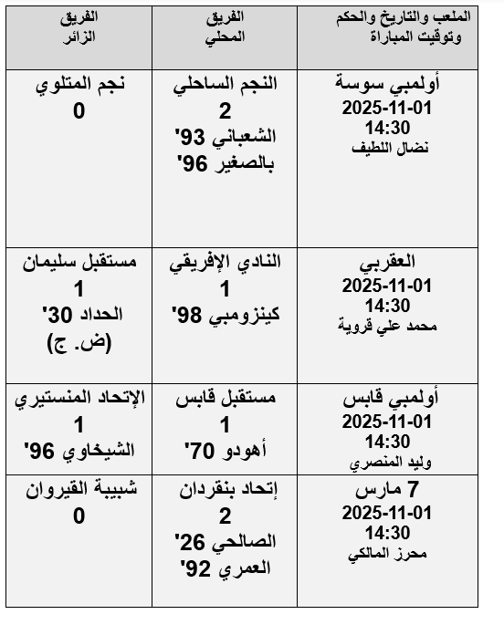 الشعب نيوز / كاظم بن عمار - جرت اليوم السبت 1 نوفمبر 2025 الدفعة الأولى من مقابلات الجولة 12 لبطولة الرابطة المحترفة الاولى لكرة القدم موسم 2025-2026 و أسفرت عن النتائج التالية :