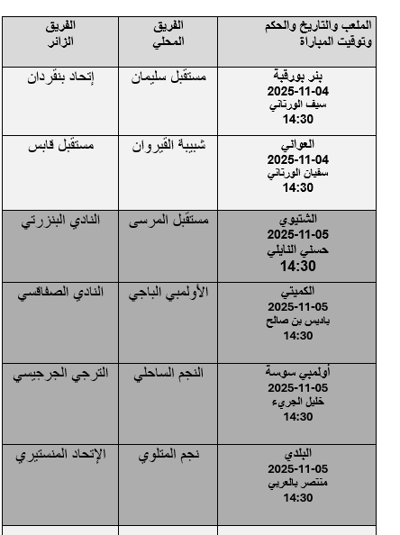 تدور يومي الثلاثاء والإربعاء 4 و 5 نوفمبر 2025 مقابلات الدفعتين الأولى و الثانية من الجولة 13 لبطولة الرابطة المحترفة الاولى لكرة القدم حسب البرنامج التالي :