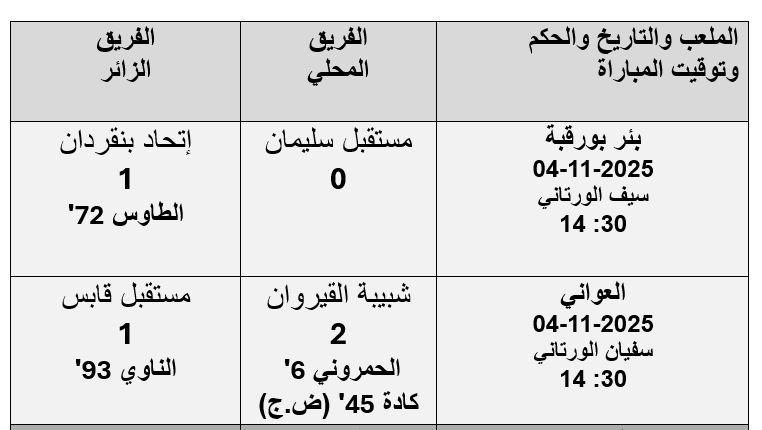 الشعب نيوز / كاظم بن عمار - جرت اليوم الثلاثاء 4 نوفمبر 2025 الدفعة الأولى من مقابلات الجولة 13 لبطولة الرابطة المحترفة الاولى لكرة القدم موسم 2025-2026 و أسفرت عن النتائج التالية :