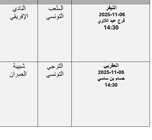 أعلنت الإدارة الوطنية للتحكيم التابعة للجامعة التونسية لكرة القدم، اليوم الأربعاء 5 نوفمبر 2025، عن تعيينات حكام مباريات الدفعة الأخيرة من الجولة الثالثة عشرة لبطولة الرابطة المحترفة الأولى، المقررة غداً الخميس 6 نوفمبر 2025.