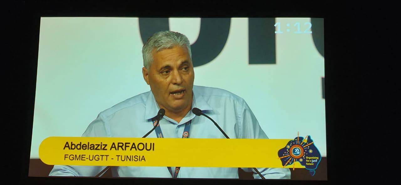 الشعب نيوز / أبو إبراهيم - قال الأخ عبد العزيز العرفاوي الكاتب العام للجامعة العامة للمعادن والالكترونيك في افتتاح المؤتمر الرابع للاتحاد الدولي للصناعات المنعقد من 04 الى 07 نوفمبر 2025 بأستراليا أن الاتحاد العام التونسي للشغل محاصر ومستهدف عبر منع التفاوض وسجن النقابيين.
