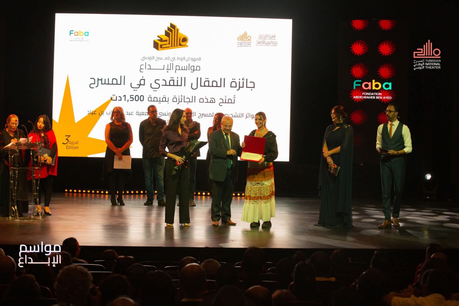 الشعب نيوز / ناجح مبارك - اختُتمت مساء السبت 8 نوفمبر 2025 فعاليات الدورة الثالثة من المهرجان الوطني للمسرح التونسي "مواسم الإبداع"، بحفل احتضنته قاعة الفن الرابع بتونس العاصمة، بحضور عدد من المسرحيين والمثقفين والإعلاميين.