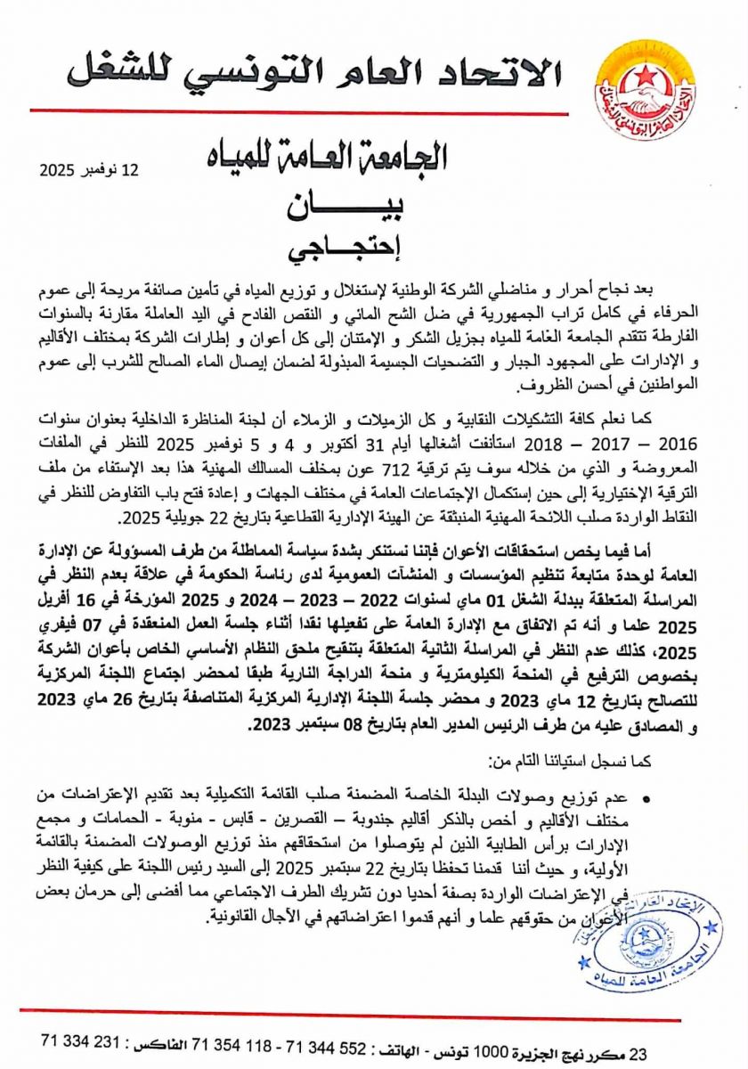 من جهة أخرى، عبّرت الجامعة العامة للمياه عن استيائها الشديد من سياسة المماطلة التي تنتهجها المسؤولة عن وحدة متابعة تنظيم المؤسسات والمنشآت العمومية برئاسة الحكومة، خاصة في ما يتعلق بعدم تفعيل الاتفاقات السابقة حول بدلة الشغل 01 ماي لسنوات 2022–2025، وعدم النظر في تنقيح النظام الأساسي لترفيع المنحة الكيلومترية ومنحة الدراجة النارية، رغم المصادقة عليها من قبل الرئيس المدير العام.