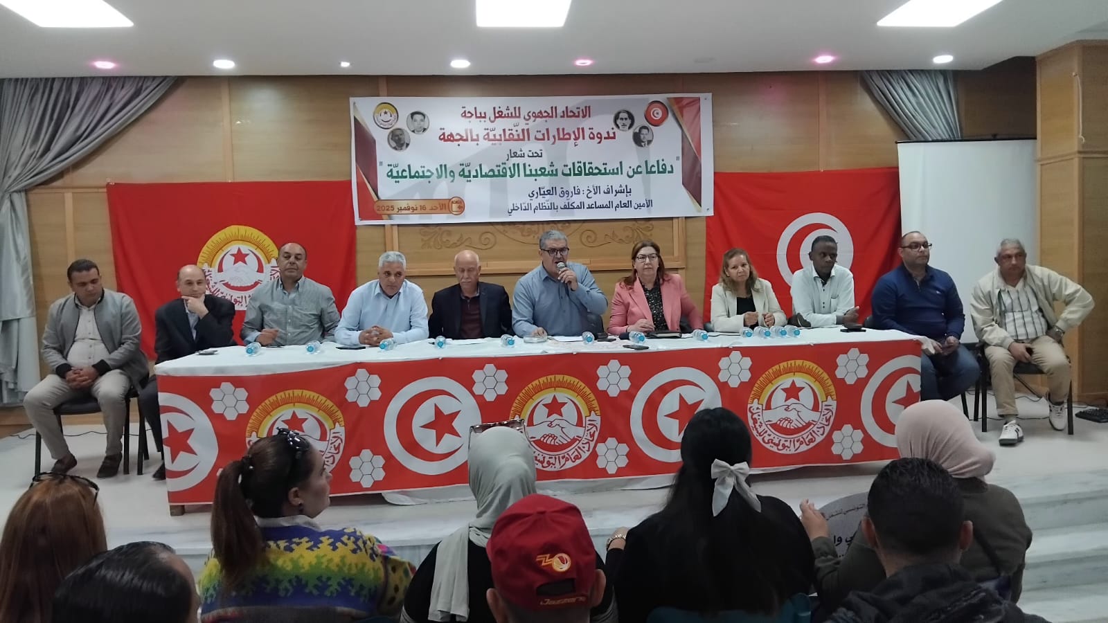 من جهته، قدّم الأخ فاروق العياري قراءة دقيقة للوضع الوطني، معتبرًا أنّ ما تشهده البلاد من تعطيل للحوار الاجتماعي وغلق لقنوات التفاوض هو مسار خطير يستهدف مباشرة الدور التاريخي للاتحاد العام التونسي للشغل.