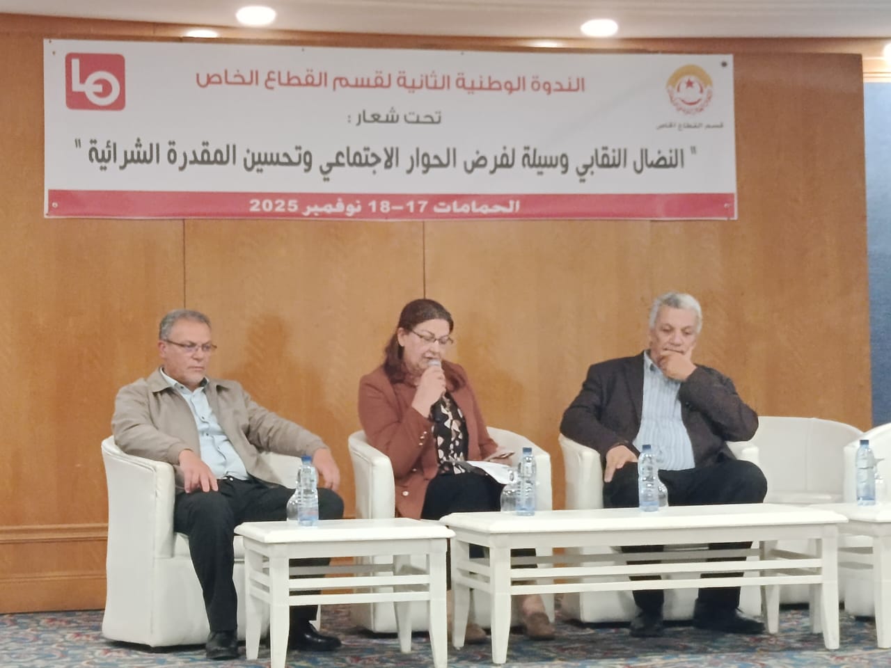 وذلك خلال الجلسة الثانية من اليوم الاول من ندوة القطاع الخاص حول النضال النقابي وسيلة لفرض الحوار الاجتماعي وتحسين المقدرة الشرائية المنعقدة يومي 17 و18 نوفمبر 2025 برئاسة الاخت سهام بوستة الامينة العامة المساعدة المسؤولة عن قسم التكوين النقابي و الأنشطة الثقافية.