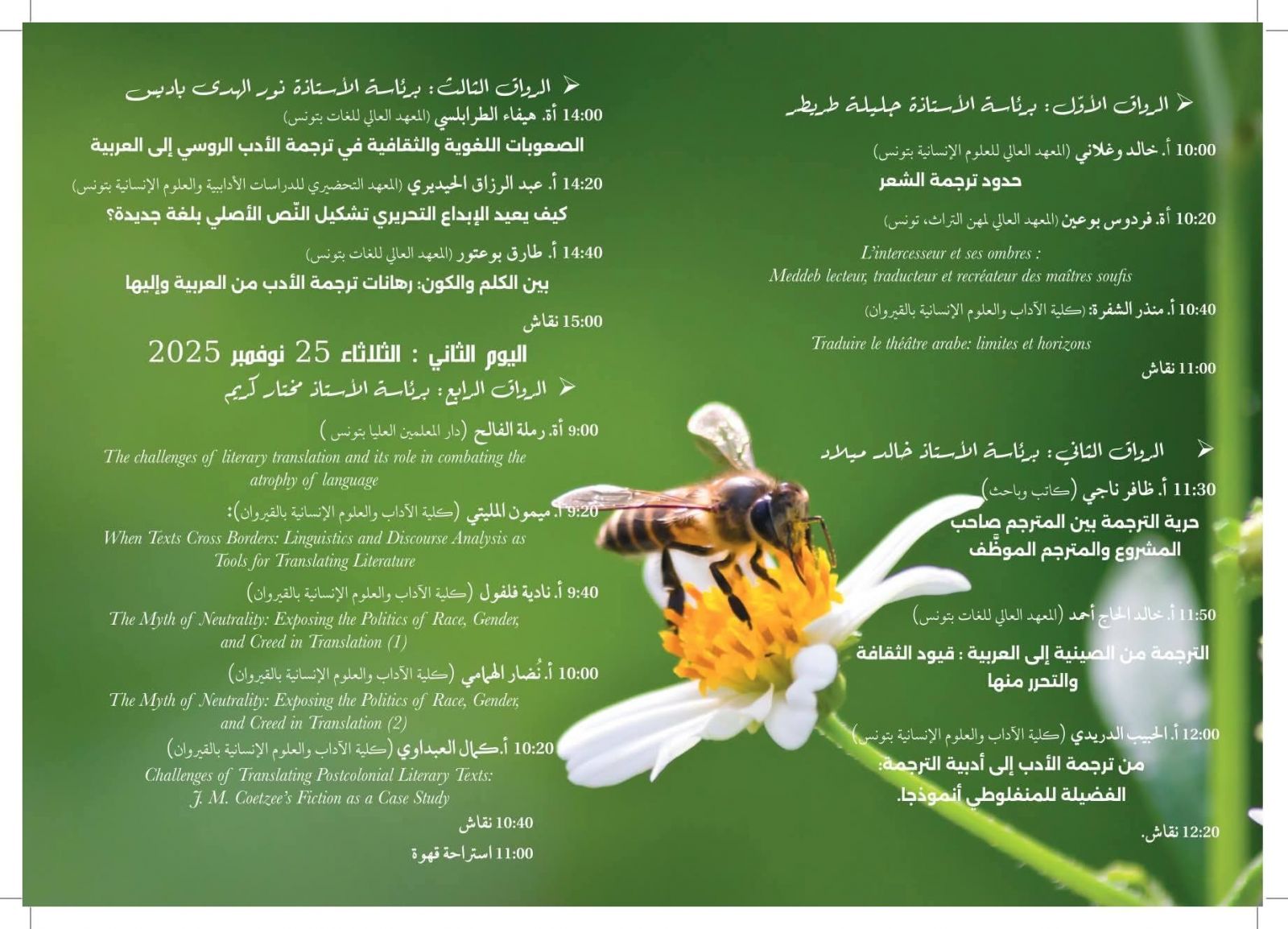 أما اليوم الثاني، فسيتضمن أربع جلسات علمية بإدارة مجموعة من الأساتذة، للتركيز على موضوع على الترجمة الأدبية وإشكاليات نقل النصوص بين اللغات، مع التطرّق إلى قضايا الحياد في الترجمة والحدود اللغوية والثقافية ودور التحليل اللساني والخطابي في تطوير أدوات المترجم.