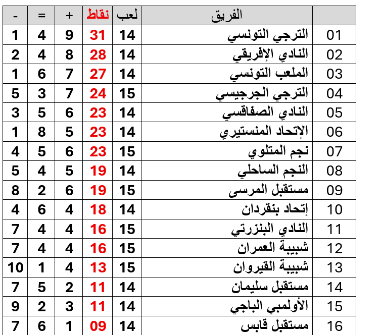 و على ضوء نتائج المقابلات المذكورة ، يصبح ترتيب البطولة عقب نهاية مقابلات الدفعة الأولى من الجولة 15 على النحو التالي :