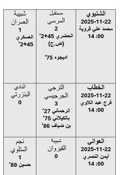 الشعب نيوز / كاظم بن عمار - جرت اليوم السبت 22 نوفمبر 2025 الدفعة الأولى من مقابلات الجولة 15 لبطولة الرابطة المحترفة الاولى لكرة القدم موسم 2025-2026 و أسفرت عن النتائج التالية :