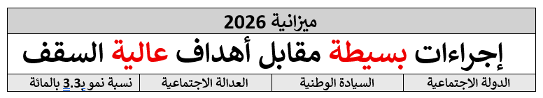 من جهة أخرى، ان شرح أسباب الميزانية تضمّن اهداف عالية السقف مقابل إجراءات بسيطة و اهم الشعارات هي الدولة الاجتماعية والسيادة والوطنية والعدالة الاجتماعية ودفع النمو الى 3.3 بالمائة.