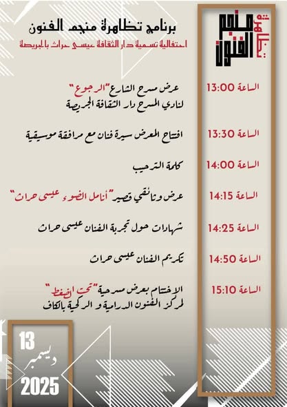 الشعب نيوز / ناجح مبارك - تحت إشراف وزارة الشؤون الثقافية، تنظّم المندوبية الجهوية للشؤون الثقافية بالكاف تظاهرة ثقافية تحت عنوان "منجم الفنون" بدار الثقافة الجريصة، وهي احتفالية تنظّمها المندوبية بمناسبة إطلاق إسم الفنّان الكبير عيسى حراث على دار الثقافة بالجريصة، وذلك يوم السبت 13 ديسمبر 2025 بداية من الساعة الواحدة ظهرا.