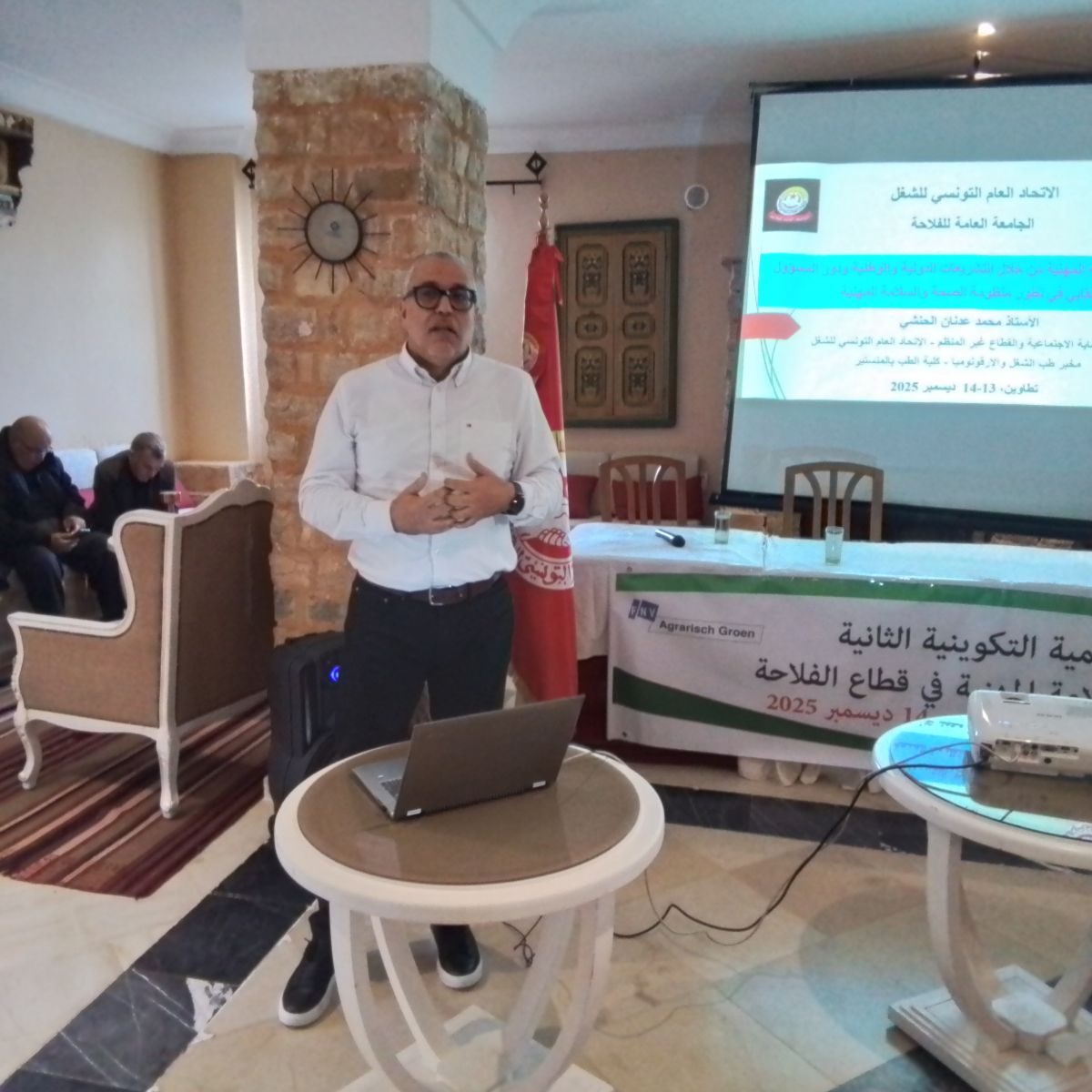 الشعب نيوز / صبري الزغيدي - على امتداد يومي السبت و الأحد 13 و 14 ديسمبر 2025 الجاري وبالتعاون مع اتحاد النقابات الهولندية FNV ، تنعقد الدورة الإقليمية التكوينية الثانية حول الصحة والسلامة المهنية في قطاع الفلاحة في احد النزل بجهة تطاوين بتأطير من الجامعة العامة للفلاحة من خلال الاخ عمار الزين كاتب عام الجامعة والاخ يونس العلوي عضو الجامعة وبإشراف من الاتحاد الجهوي للشغل بتطاوين عبر الاخ الشريف البريني كاتب عام الاتحاد الجهوي برفقة الاخ محسن الخرشاني عضو الاتحاد الجهوي، وذلك بمشاركة نقابيات ونقابيين من جهات قبلي وقابس ومدنين وتطاوين.