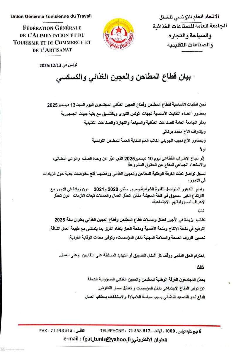 في ما يلي صور لنص بيان قطاع المطاحن و العجين الغذائي و الكسكسي الصادر اليوم السبت 13 ديسمبر 2025 :