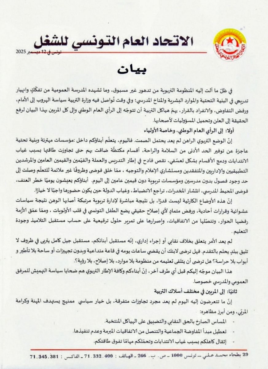 وختم البيان بالتأكيد على أنّ وحدة المربين، والتفاف الأولياء حولهم، ليست فعلاً احتجاجياً عابراً، بل رسالة وطنية صادحة: لا للتهميش، لا لضرب الحقوق، لا لتفكيك المدرسة العمومية. فالدفاع عن التعليم اليوم هو دفاع عن تونس الغد.