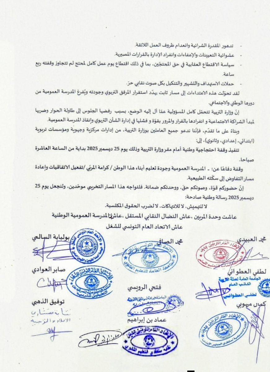 ومن هنا، تتوجّه الدعوة إلى كل المربين والعاملين بقطاع التربية للمشاركة في الوقفة الاحتجاجية الوطنية يوم 25 ديسمبر 2025 أمام مقر وزارة التربية، دفاعاً عن المدرسة العمومية، وعن كرامة المربي، وعن حقّ أبناء تونس في تعليم جيّد وآمن.