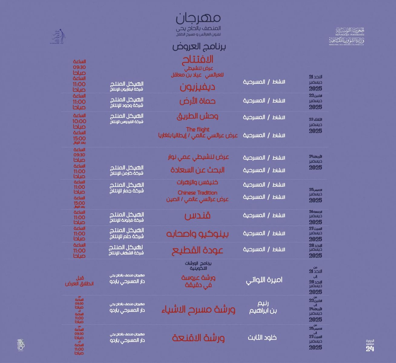 الشعب نيوز / ناجح مبارك -  تزامنا مع العطلة المدرسية للثلاثي الأوّل ، ينظّم المركز الوطني لفنّ العرائس الدورة الرابعة والعشرين (24) من مهرجان المنصف بالحاج يحيى لفنون العرائس ومسرح الطفل وذلك من 21 إلى 28 ديسمبر 2025 بدار المسرحي بباردو.