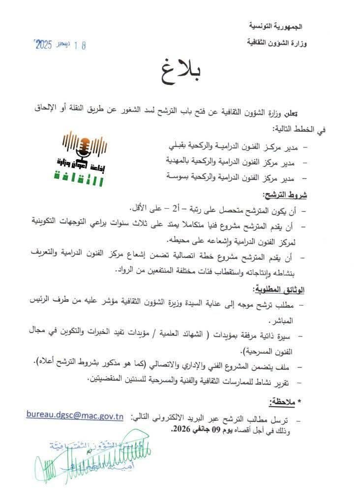 الشعب نيوز / ناجح مبارك - أصدرت وزارة الشؤون الثقافية مؤخرا بلاغا لإعلام الفنانين والاداريين ممن تتوفر فيهم الشروط ومنها التمتع برتبة إدارية ووظيفية أ2 بالترشح وقبل 9 جانفي 2026 لإدارة أحد مراكز الفنون :