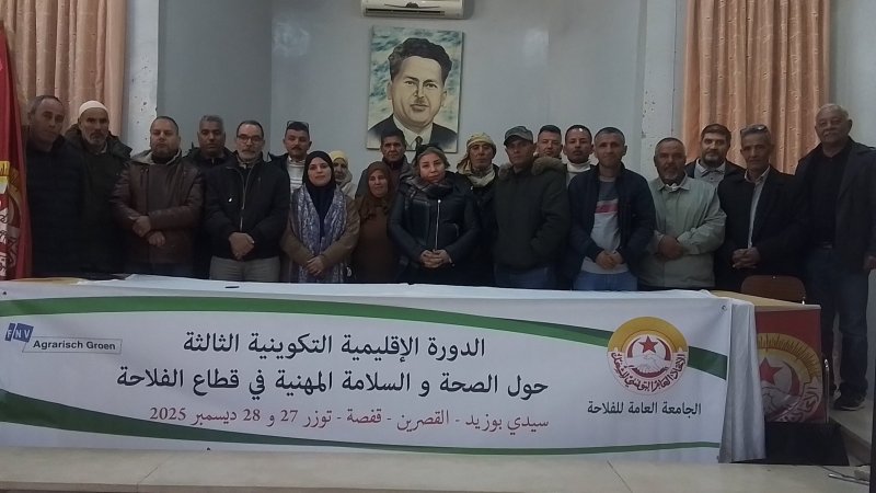 الشعب نيوز / صبري الزغيدي - تختتم اليوم الأحد 28 ديسمبر 2025 الجاري الدورة التكوينية الثانية حول الصحة والسلامة المهنية في قطاع الفلاحة والتي انطلقت امس السبت 27 ديسمبر 2025 بالشراكة مع فيدرالية النقابات الهولندية FNV ، بجهة توزر بتأطير من الجامعة العامة للفلاحة وبإشراف من الاتحاد الجهوي للشغل بتوزر وبالتنسيق مع قسمي العلاقات العربية والدولية والحماية الاجتماعية وذلك بمشاركة نقابيات ونقابيين من جهات توزر والقصرين وقفصة وسيدي بوزيد.