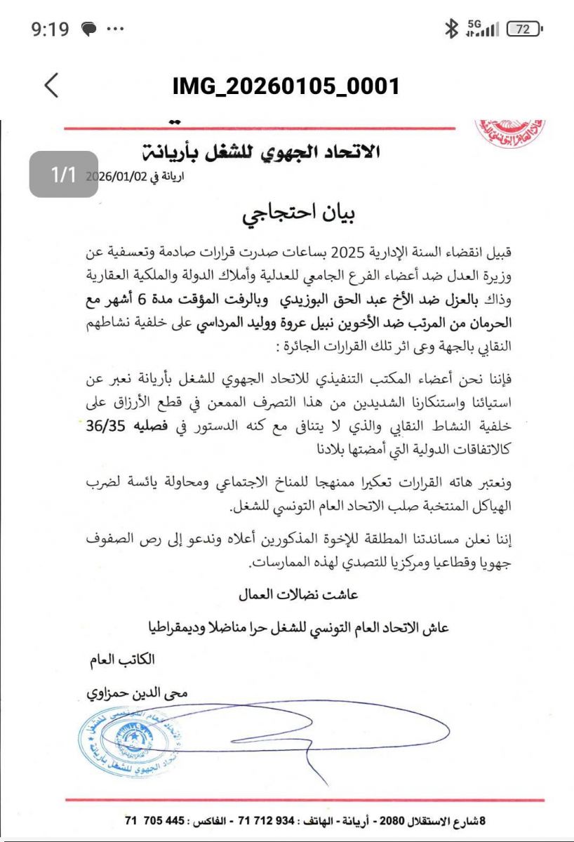 واعتبر المكتب التنفيذي للاتحاد الجهوي للشغل بأريانة أن هذه الإجراءات تمثل مساسًا بالحق النقابي وتعكّر المناخ الاجتماعي، مؤكداً أنها تتعارض مع مقتضيات الدستور التونسي، ولا سيما الفصلين 35 و36، إلى جانب الاتفاقيات الدولية التي صادقت عليها تونس والمتعلقة بالحريات النقابية.