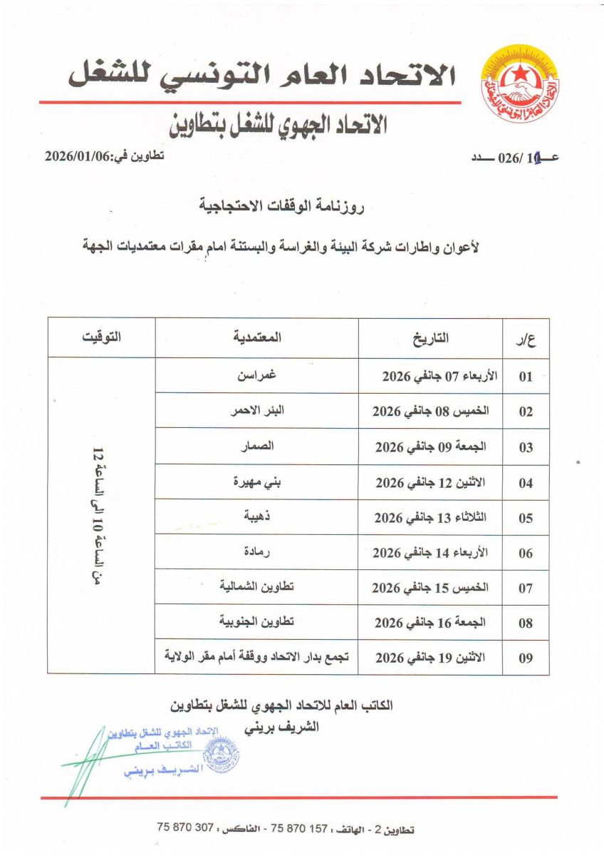 - تنظيم "يوم غضب جهوي" يوم الاثنين 19 جانفي 2026، يبدأ بتجمع عمالي بدار الاتحاد الجهوي للشغل بتطاوين، ثم الانطلاق في وقفة احتجاجية أمام مقر الولاية.