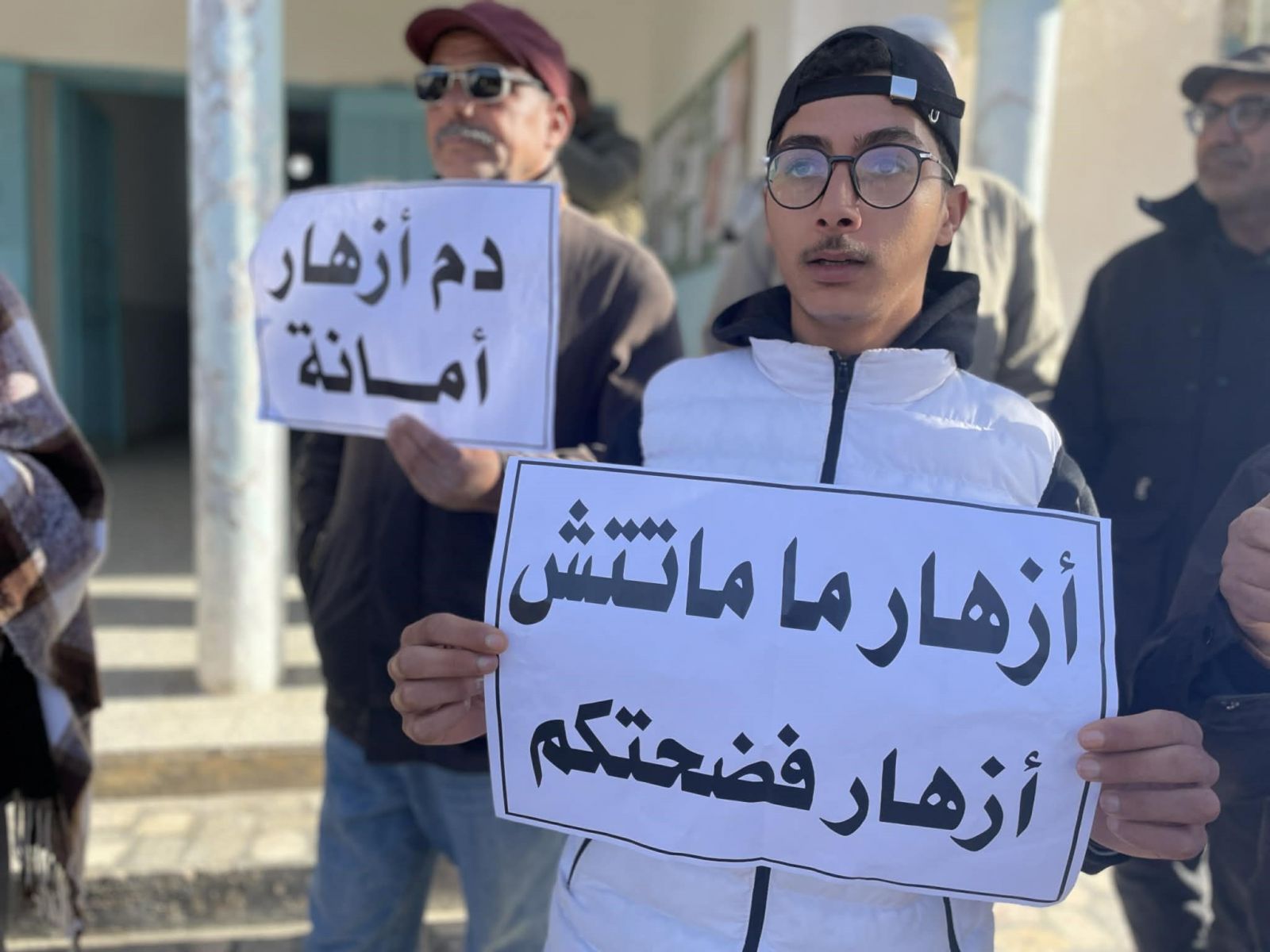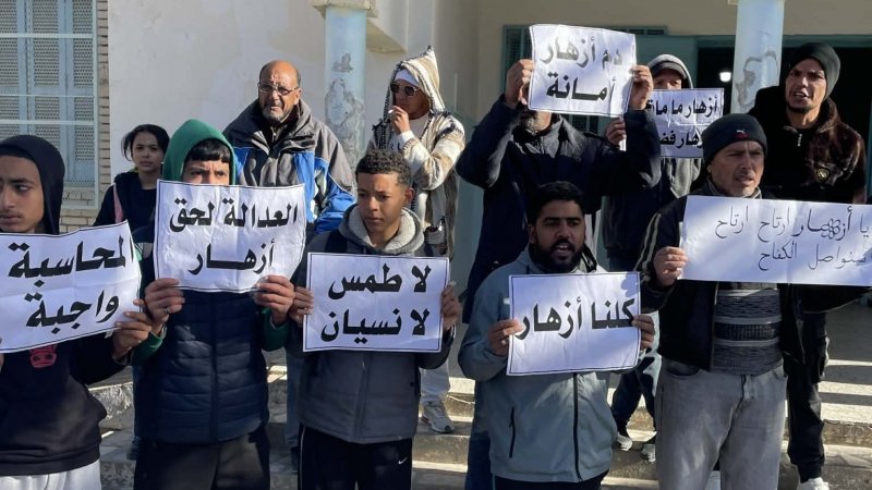 وكانت أزهار بن حميدة قد توفيت متأثرة بحروق بليغة أصيبت بها أثناء أداء مناوبة ليلية في المستشفى المحلي، وسط روايات متضاربة حول سبب الحادث (جهاز تدفئة أو اندلاع حريق مفاجئ)، ما أثار شكوكاً واسعة لدى عائلتها ونشطاء الجهة في وجود إهمال ممنهج، غياب شروط السلامة الأساسية، تأخر الإسعافات، ومحاولات محتملة للتستر على المسؤوليات. وردد المحتجون شعارات مثل "حق أزهار لن يطمس"، "الإهمال يقتل"، و"العدالة لأزهار"، معبرين عن غضبهم من تدهور المنظومة الصحية العمومية في المناطق الداخلية، ومطالبين بمحاسبة كل من ثبت تقصيره أو إهماله في توفير بيئة عمل آمنة. حضور المعتمد وتحذيرات حاسمة من الأهالي وفي ختام الوقفة، وتحت ضغط الاهالي حضر معتمد المنطقة إلى المكان للاستماع إلى مطالب المحتجين. أبلغه الأهالي بتمسكهم الراسخ بمواصلة تحركاتهم السلمية حتى تحقيق مطالبهم كاملة، مؤكدين أن دوره كمسؤول إداري يفرض عليه العمل الجاد لتوفير مناخ اجتماعي سليم ومستقر في الجهة، وهو ما لا يتحقق إلا بكشف الحقيقة الكاملة، إنصاف الراحلة وذويها، وإجراء تحقيق مستقل وشفاف يحدد المسؤوليات بدقة. وحذّر المحتجون بشدة من أي محاولات من بعض الجهات الإدارية لتصعيد الوضع عبر رفع قضايا جزائية ضد بعض زملاء الراحلة أو ضد المواطنين والناشطين المساندين للقضية، معتبرين ذلك خطوة استفزازية ستزيد من الاحتقان الشعبي وتعرقل مسار العدالة بدلاً من خدمته.