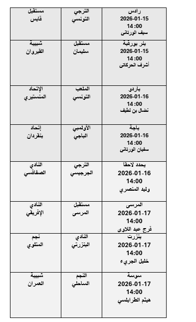 كشفت لجنة التعيينات اليوم الاربعاء عن الحكام الذين سيديرون مقابلات الجولة الأولى اياب من البطولة الوطنية والتي تدور انطلاقا من الغد الخميس 15 جانفي 2026