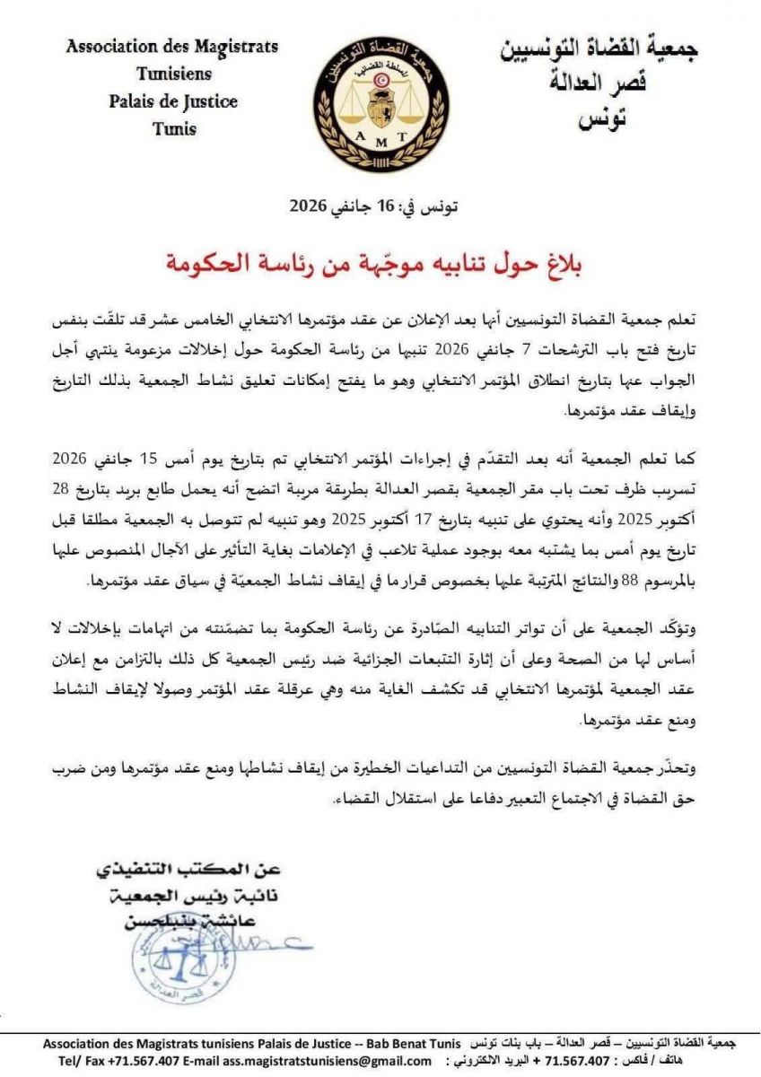 الشعب نيوز/ وسائط - أعلنت جمعية القضاة التونسيين، في بلاغ أصدرته اليوم الجمعة 16 جانفي 2026، أنّها تلقت تنبيهات من رئاسة الحكومة قد تؤدي إلى تعليق نشاطها وإيقاف عقد مؤتمرها الانتخابي الخامس عشر، المعلن عنه مسبقًا.