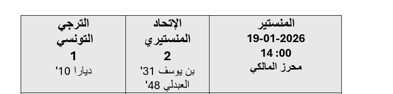 الشعب نيوز / كاظم بن عمار - جرت اليوم الإثنين 19 جانفي 2026 مباراة الإتحاد المنستيري و ضيفه الترجي التونسي ضمن الدفعة الأولى من مقابلات الجولة الثانية إياب لبطولة الرابطة المحترفة الأولى لكرة القدم وأسفرت عن النتيجة التالية :