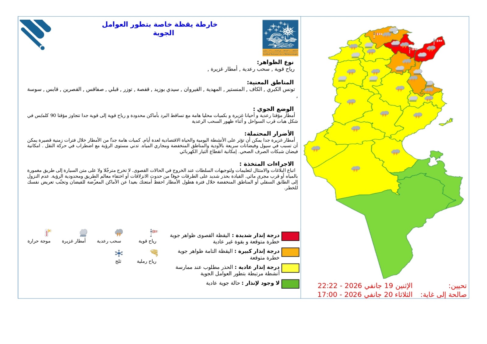و أوضحت خارطة اليقظة التي نشرها المعهد على موقعه الرسمي وفي صفحة التواصل الاجتماعي تونس ونابل باللون الأحمر.