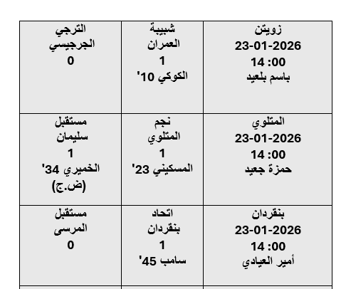 الشعب نيوز / كاظم بن عمار - إنتهت الأشواط الأولى من مباريات الدفعة الخامسة و الأخيرة من مباريات الجولة الثانية إياب لبطولة الرابطة المحترفة الأولى لكرة القدم موسم 2025-2026 و أسفرت عن النتائج التالية :